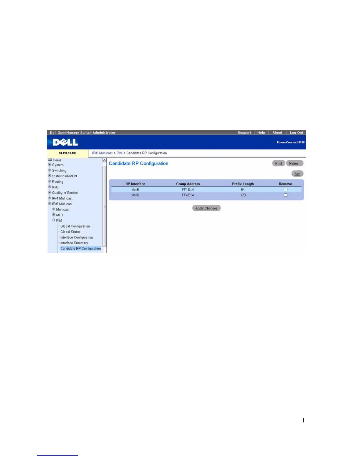 After entering all required data, click Apply Changes to configure an interface as a PIM candidate.