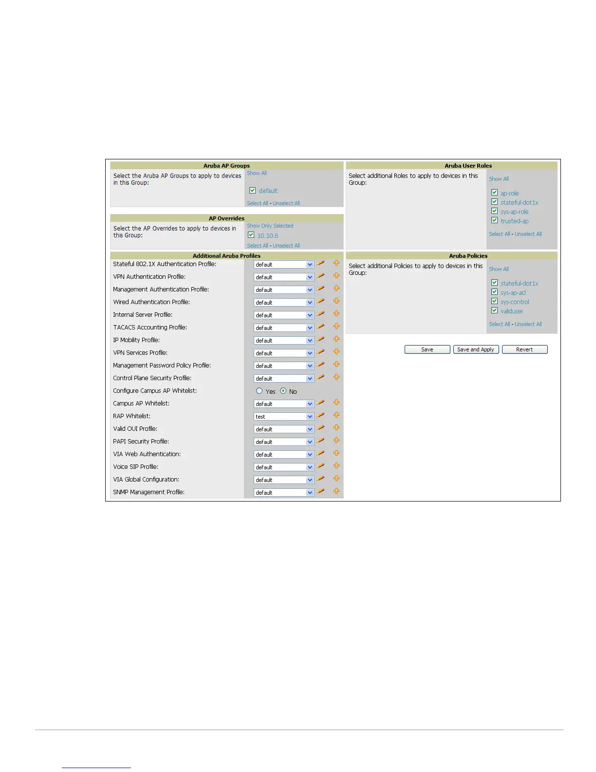z Use this page to associate a standard device group to one or more Aruba AP Groups.