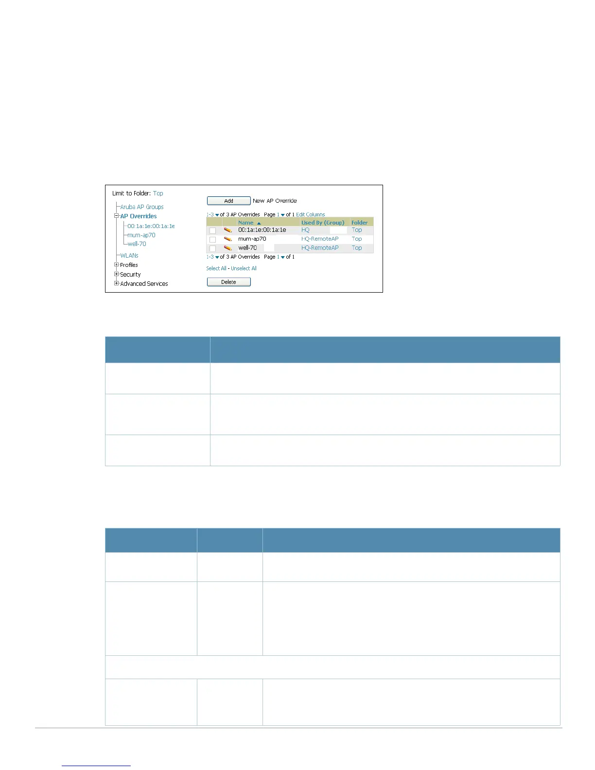 The AP Overrides component of Aruba Configuration allow you to define device-specific settings for an AP