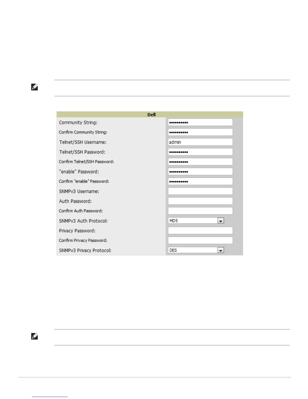 2. In the Default Credentials section, select the Edit link next to Dell PowerConnect W. The page illustrated in