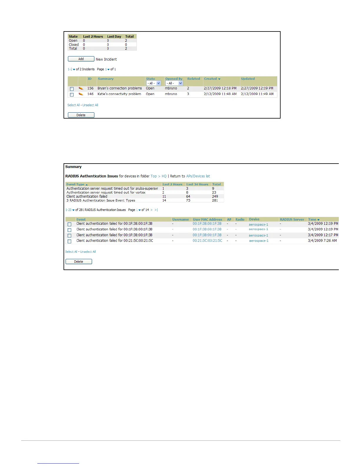 of RADIUS Authentication issues by type, and all such issues listed in chronological sequence and by
