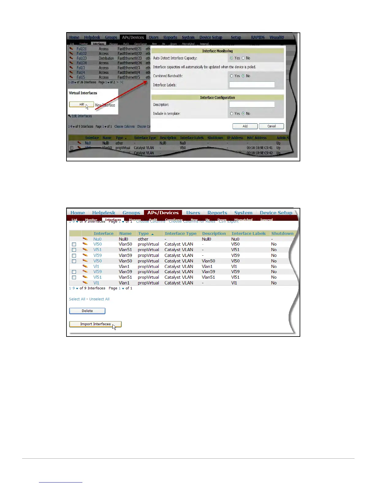 New physical and virtual interfaces are discovered using SNMP polling as described in “SNMP/HTTP Scanning”