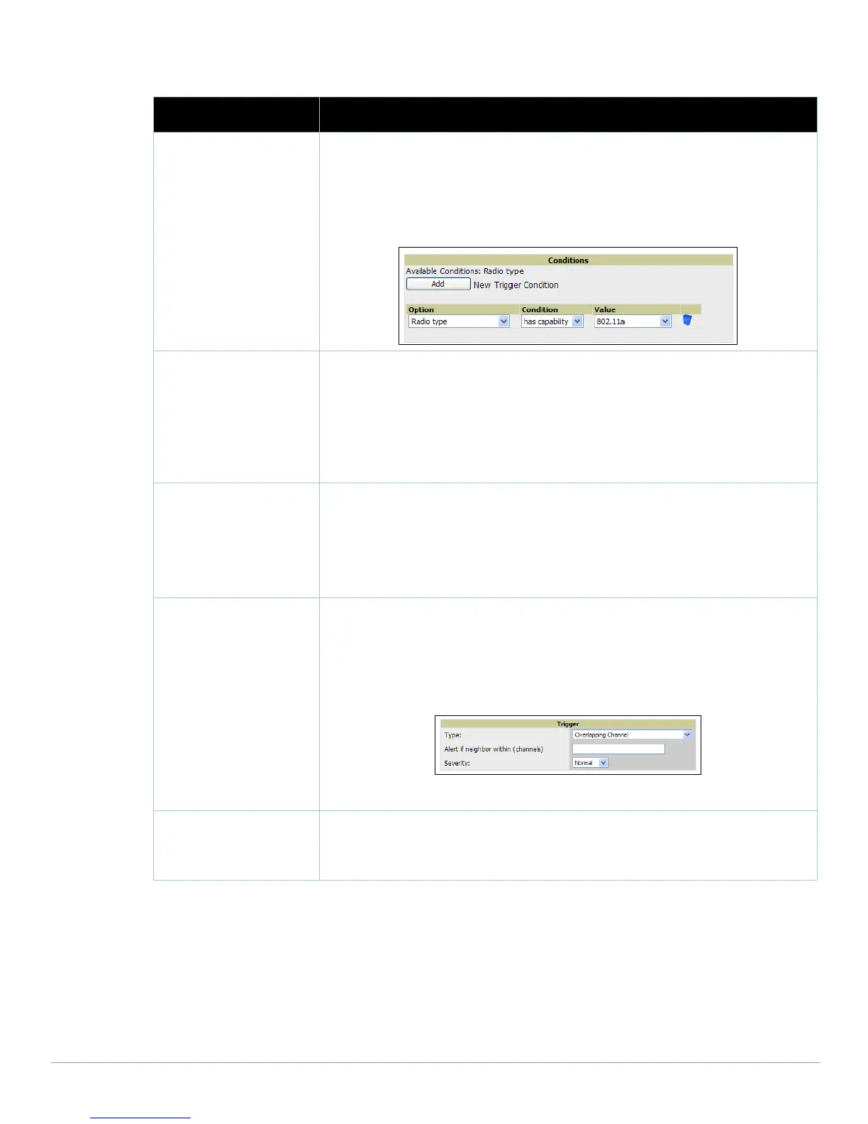 NOTE: There is no Conditions configuration for Radios: Overlapping Channel triggers.