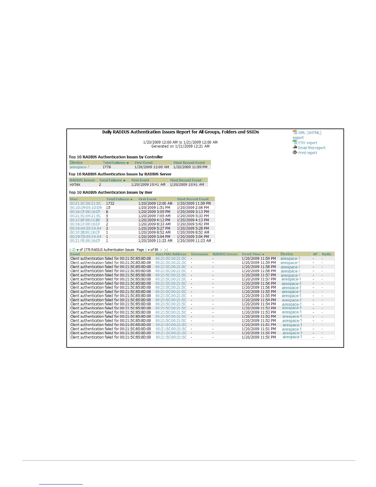 The RADIUS Authentication Issues Report contains issues that may appear with AP controllers, RADIUS