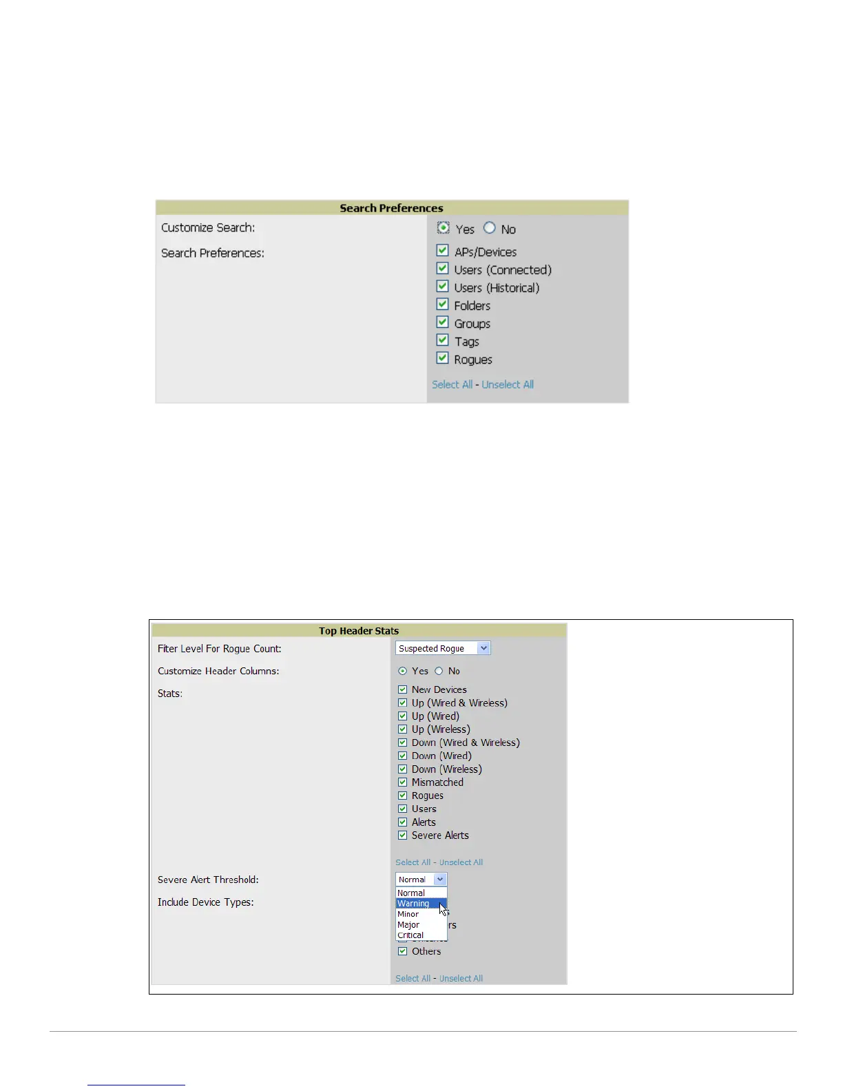 critical alerts can see severe alerts. The Severe Alert Threshold dropdown menu, located in the Top Header Stats