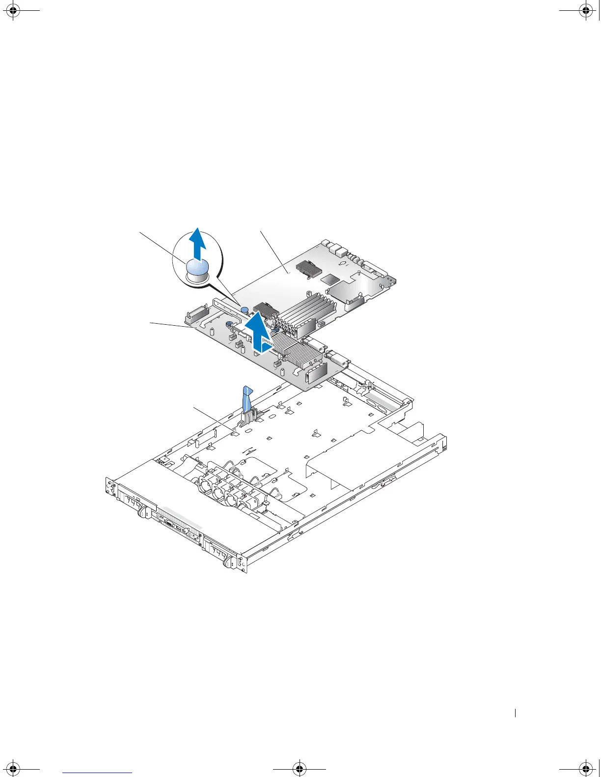 Lift up the blue retention pin and slide the system board towards the front of the system