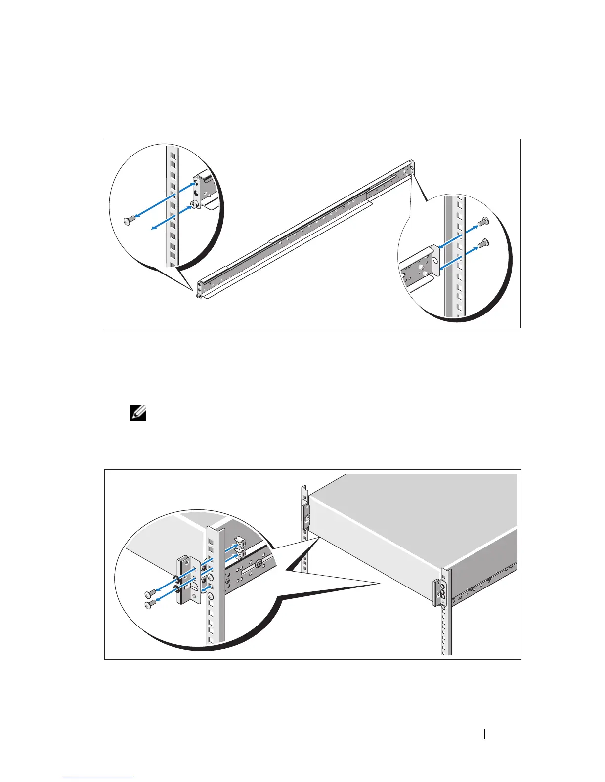 Fije los rieles deslizantes a la parte frontal del rack mediante dos tornillos