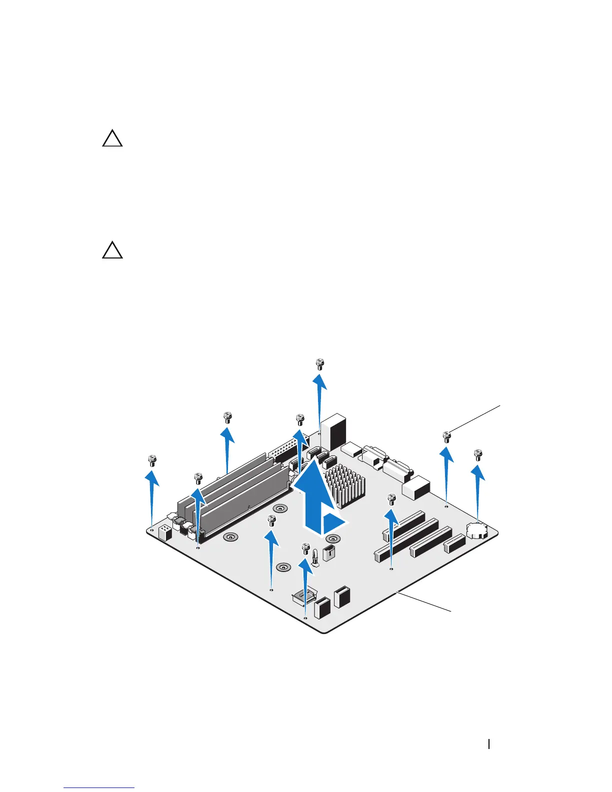 CAUTION: Do not lift the system board by grasping a memory module, processor,