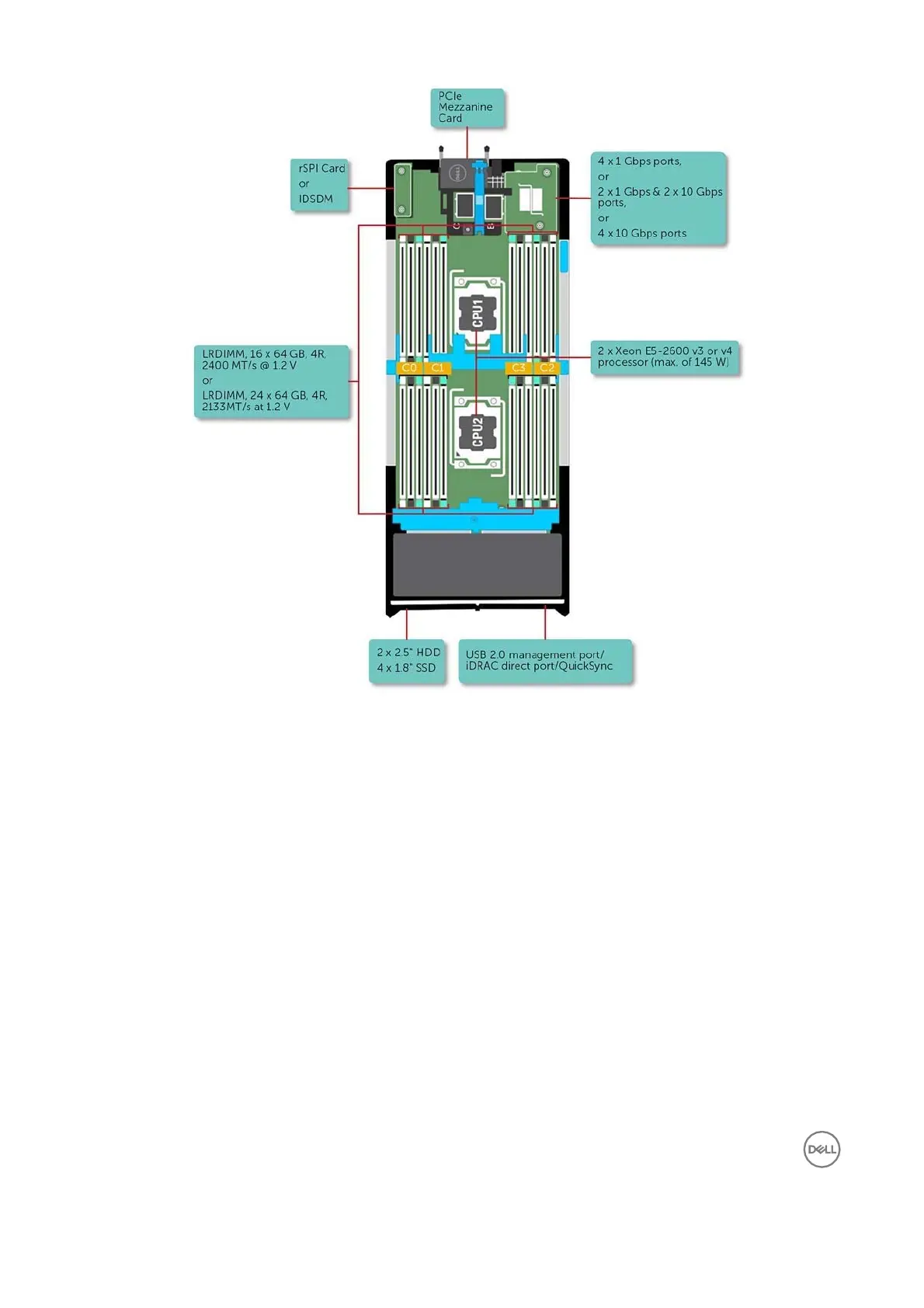 The features on the front panel include USB management port, iDRAC Direct LED indicator, sled handle and status indicator.