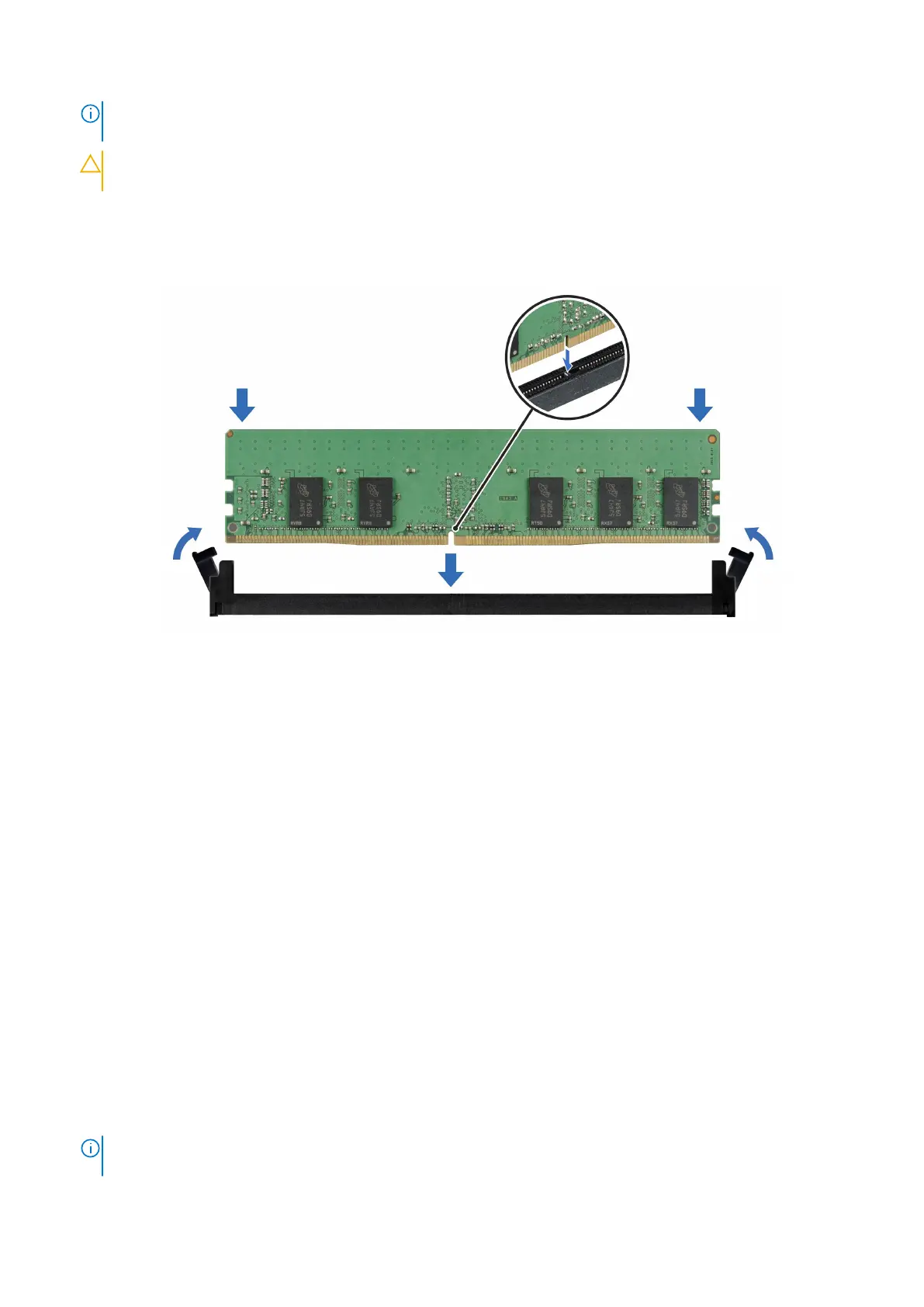 CAUTION: Do not apply pressure at the center of the memory module; apply pressure at both ends of the