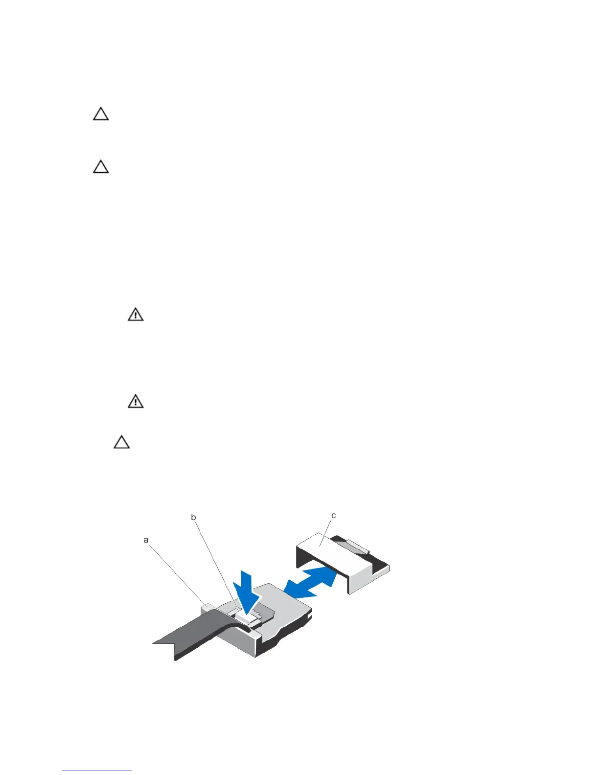 b) Press down and hold the metal tab on the mini SAS cable connector.