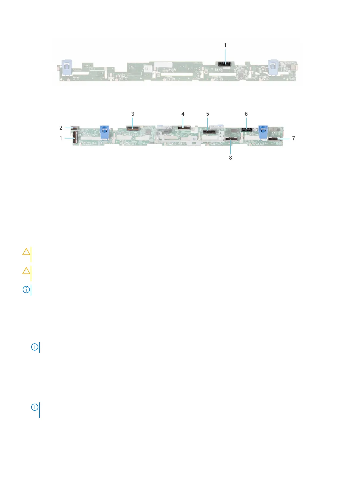 8. Disconnect the drive backplane cables from the connectors on the system board.