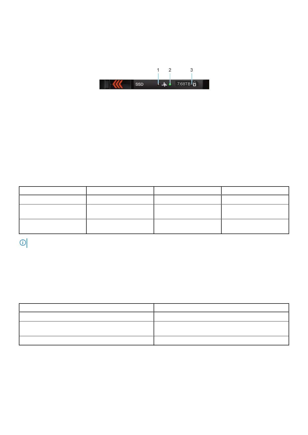 The LEDs on the drive carrier indicate the state of each drive. The LEDs on the EDSFF E3.S drive have two LEDs: an activity