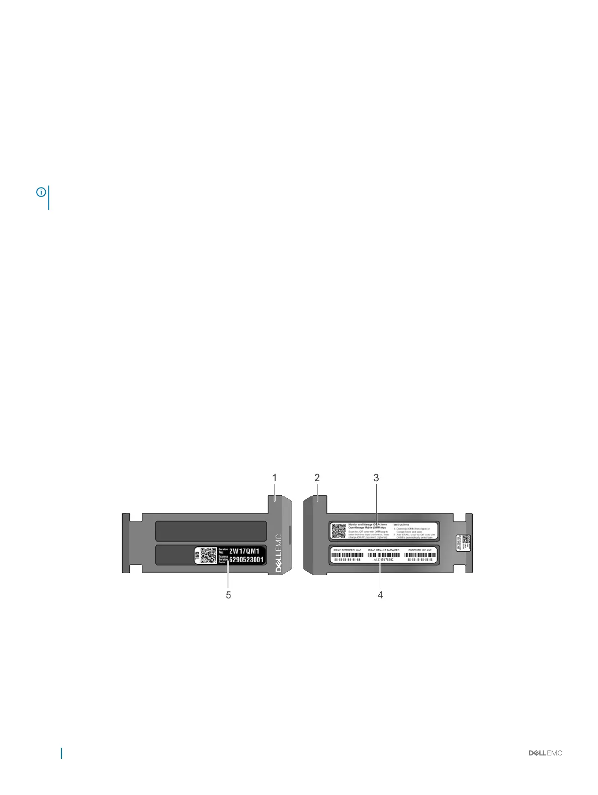 3 OpenManage Mobile (OMM) label 4 iDRAC MAC address and iDRAC secure password label