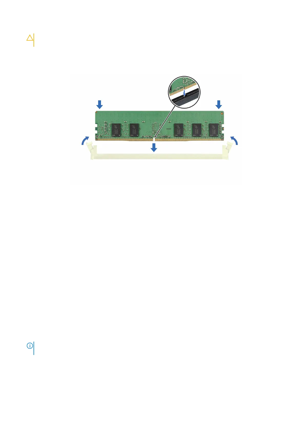 CAUTION: Do not apply pressure at the center of the memory module; apply pressure at both ends of the
