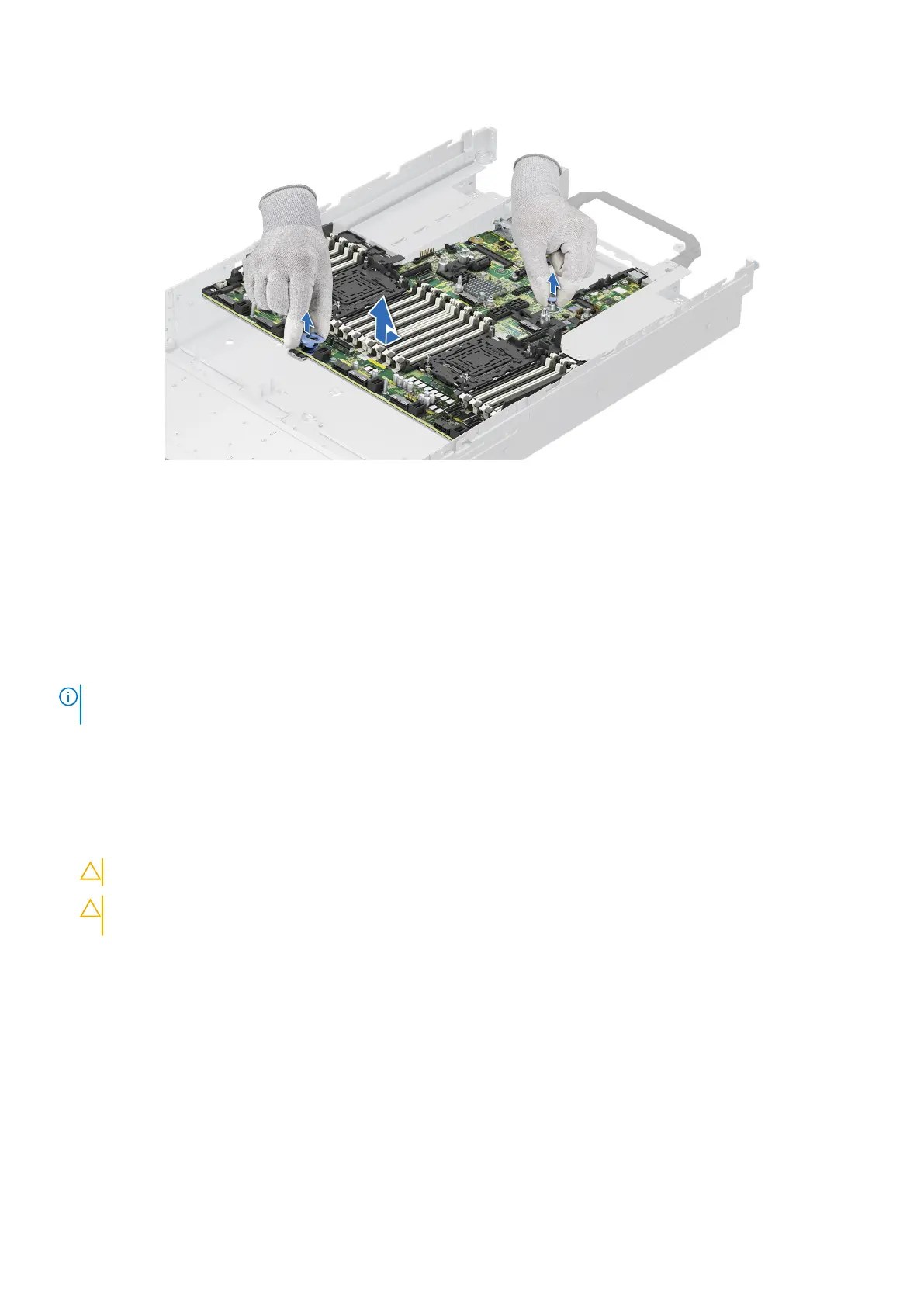 CAUTION: Do not lift the system board by holding a memory module, processor, or other components.