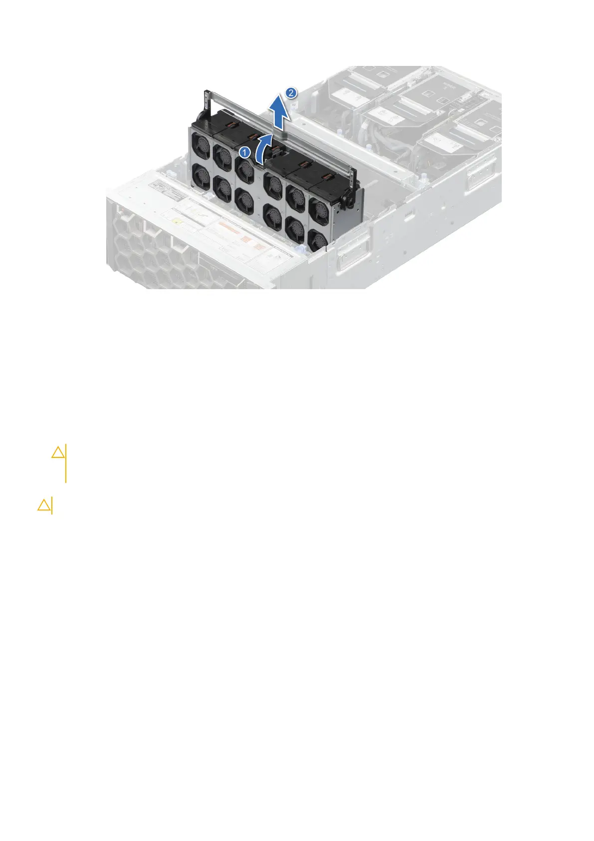 CAUTION: Handle with care because the cooling fan cage assembly is heavy, and lay it down horizontally.