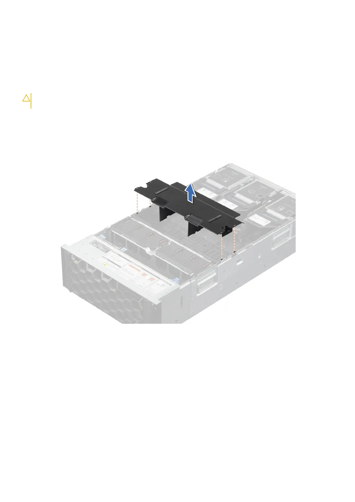 Holding the edges of the air shroud top cover, lift the top cover out of the air shroud.