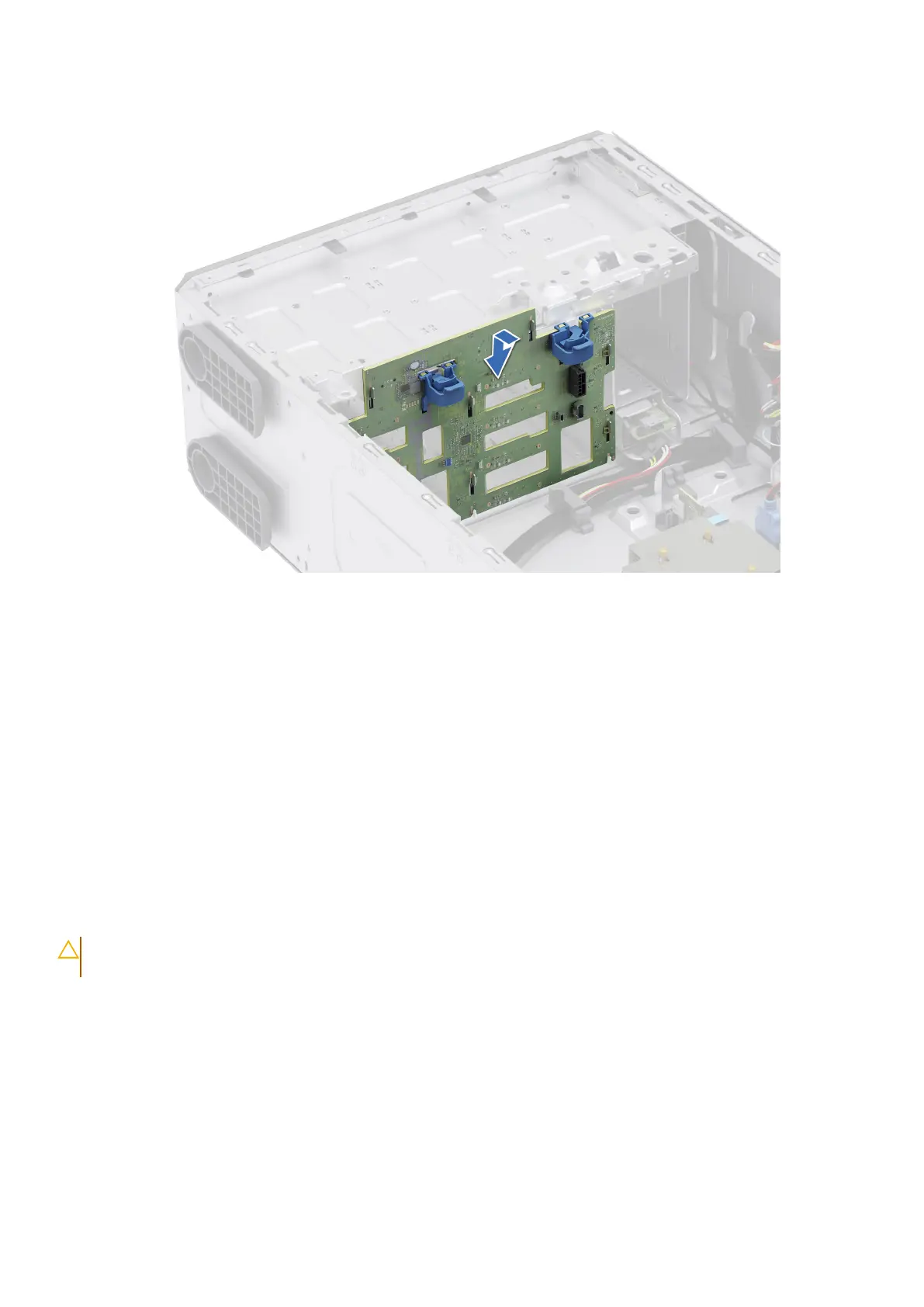 2. Slide the drive backplane into the guides and lower the backplane until the blue release tabs clicks into place.