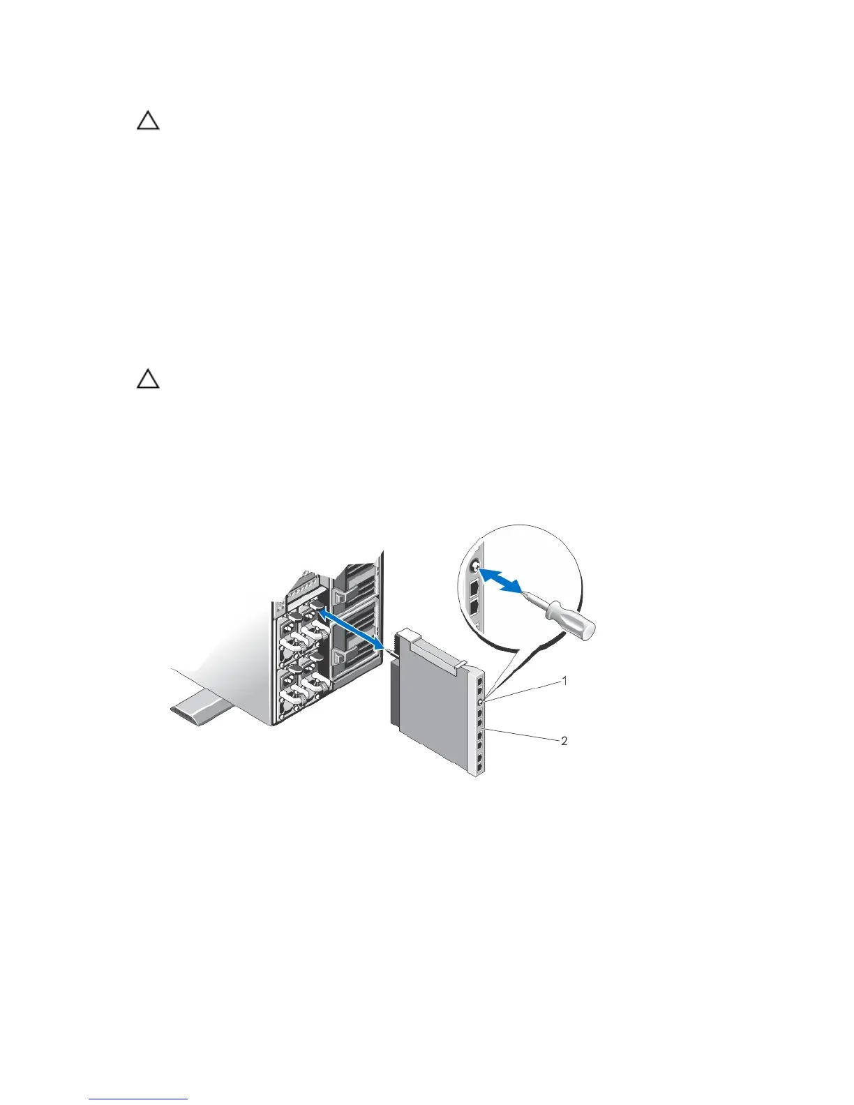 1. Align the blower module bay with the slot on the back of the enclosure, and slide it in until it aligns with the screw