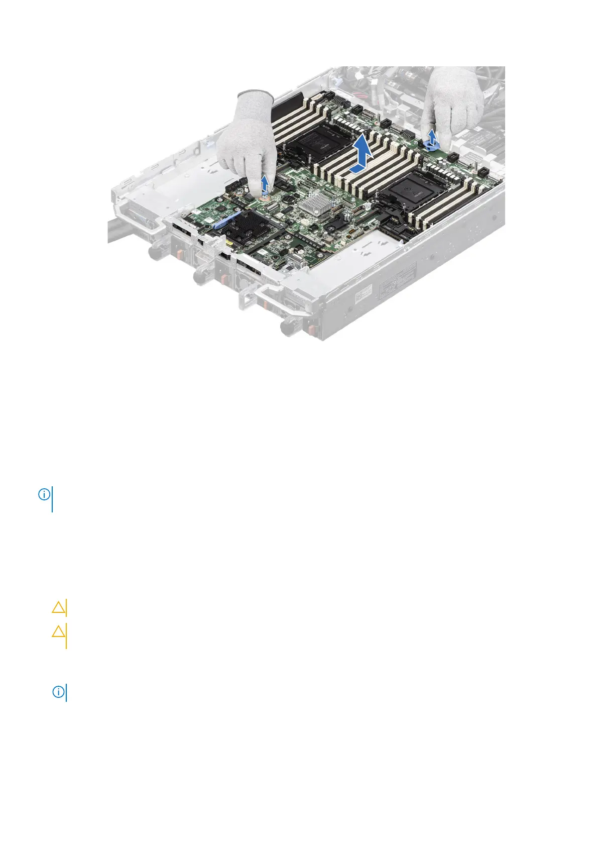 CAUTION: Do not lift the system board by holding a memory module, processor, or other components.