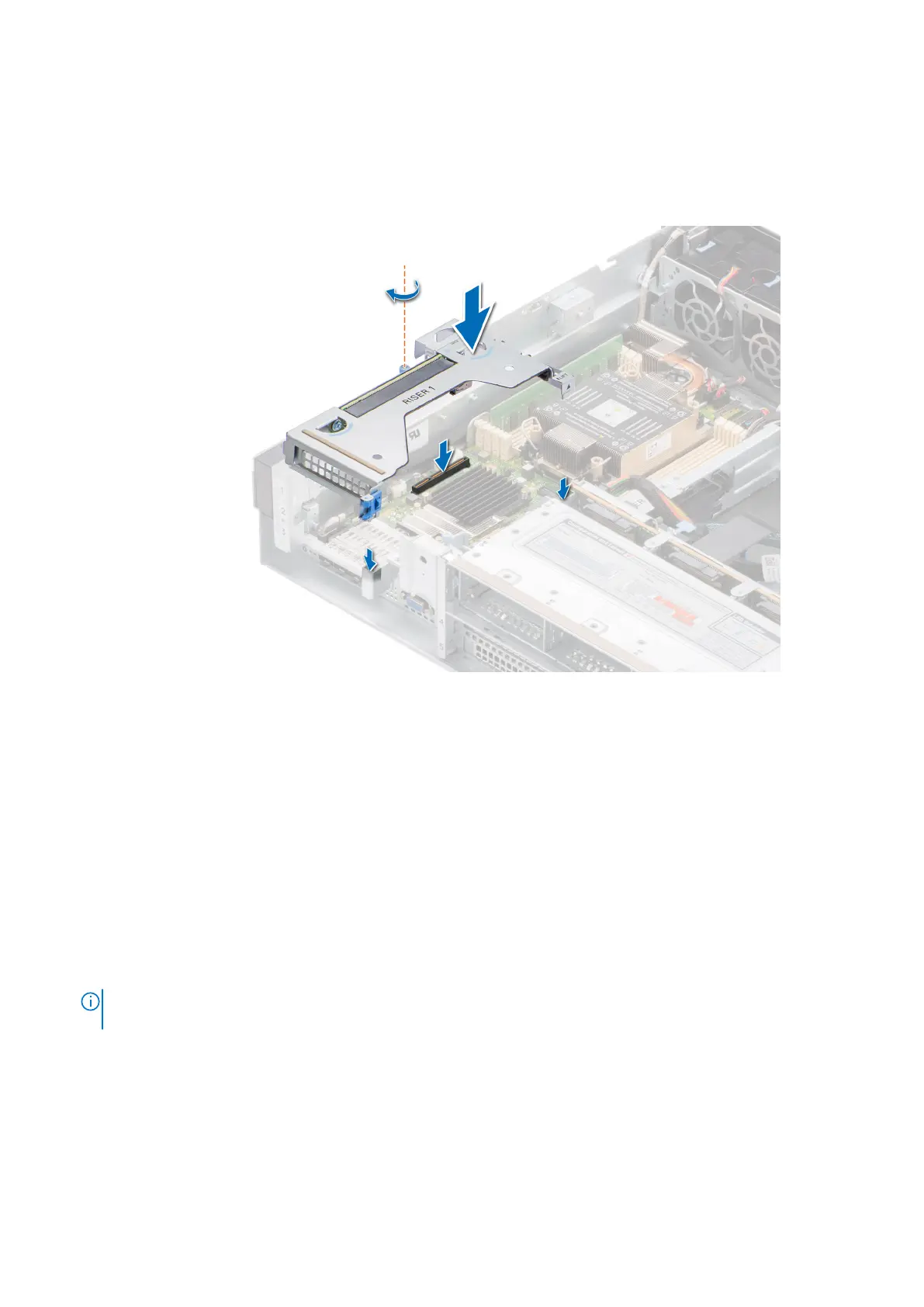 1. Holding the blue touch points, align the expansion card riser with the guide pins on the side wall of the chassis and with the