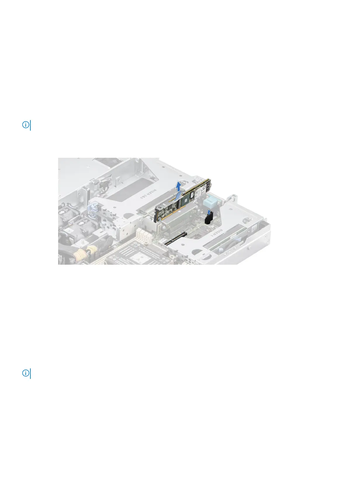 Holding the blue tag, pull the M.2 BOSS card away from the system board connector.