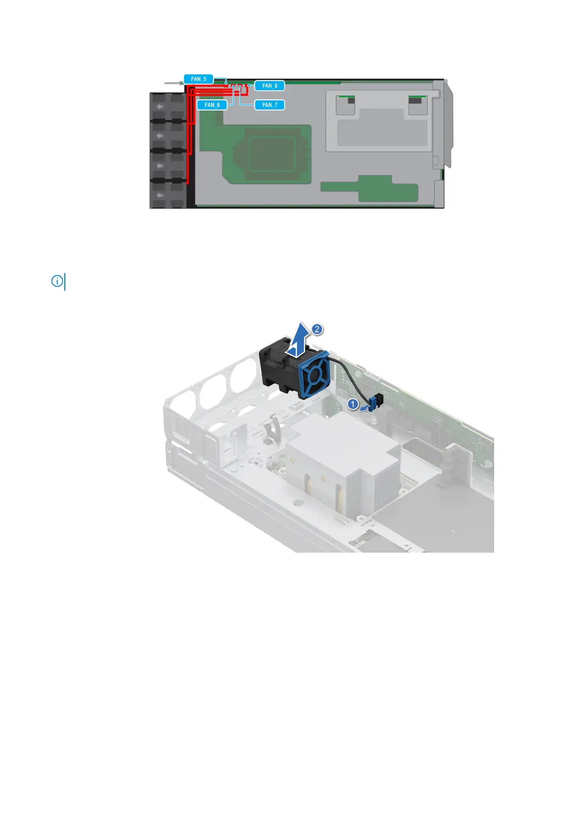 2. Pull slightly to disengage the fan cable from the fan guard and then lift the fan module out of the fan cage.