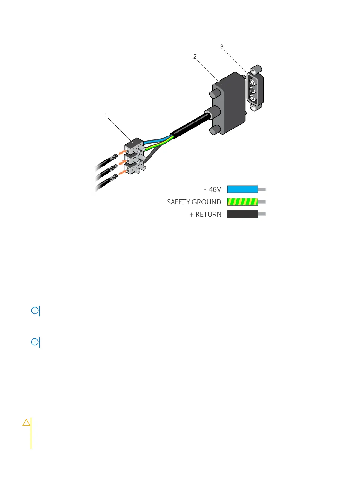 2. Insert each of the bare wire power connector lengths into the wiring block. The blue wire is -48 V, the black wire is the