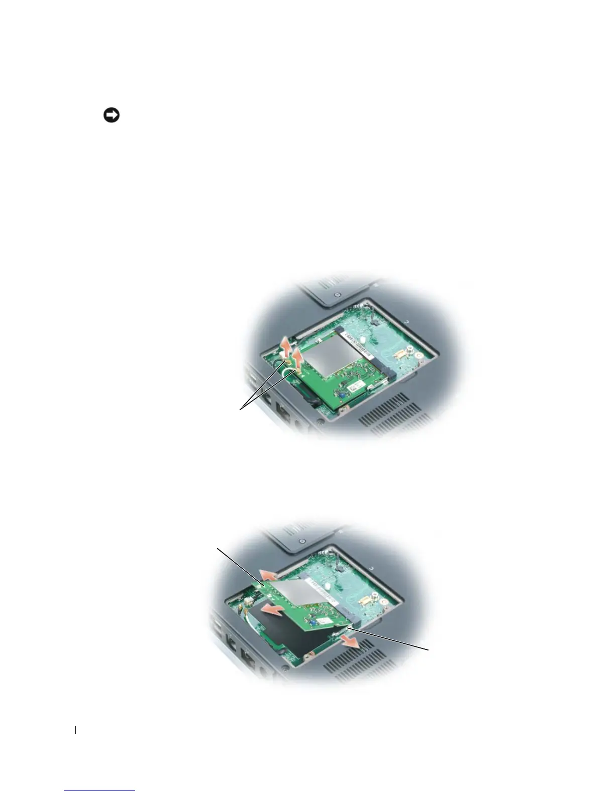 Release the Mini PCI card by spreading the metal securing tabs until the card pops up