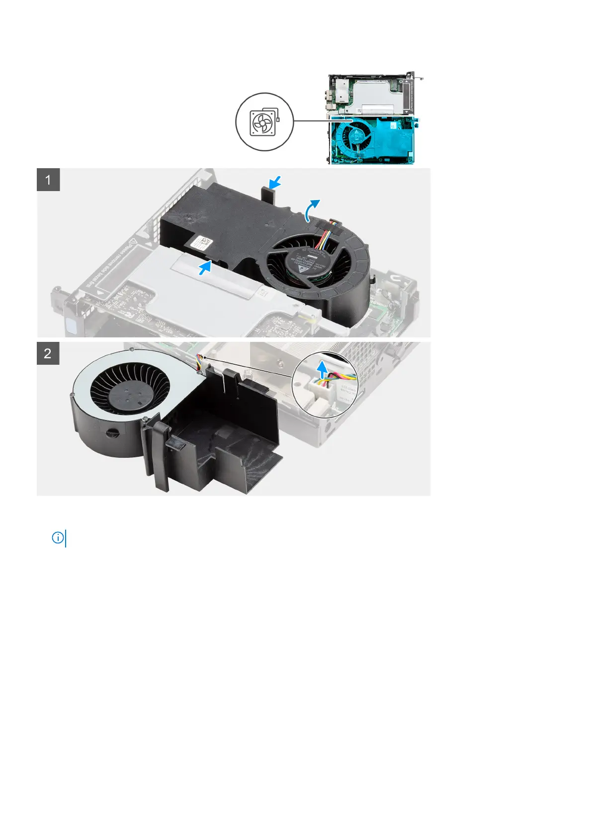Press the blue tabs on both sides of the fan, and slide to lift the fan to release it from the system and turn it over.