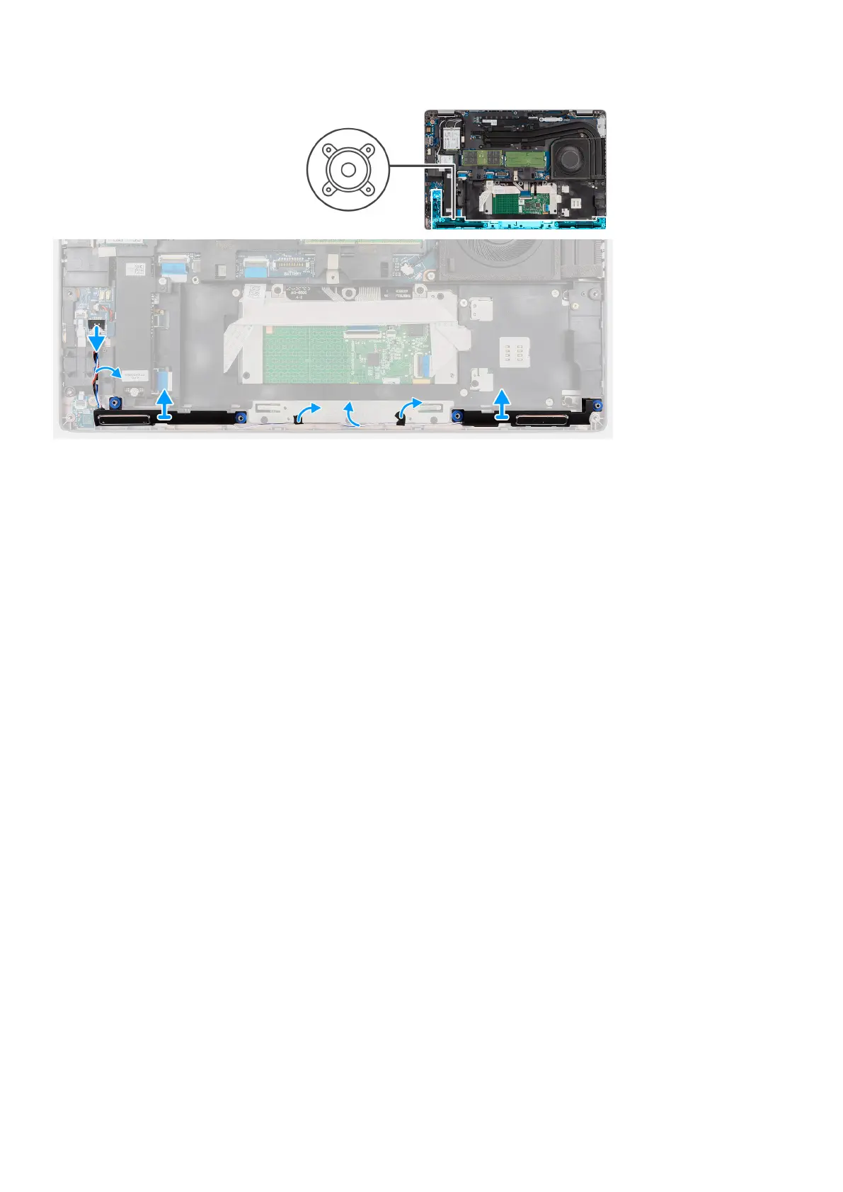 4. Lift the speakers, along with the cable, off the palm-rest and keyboard assembly.