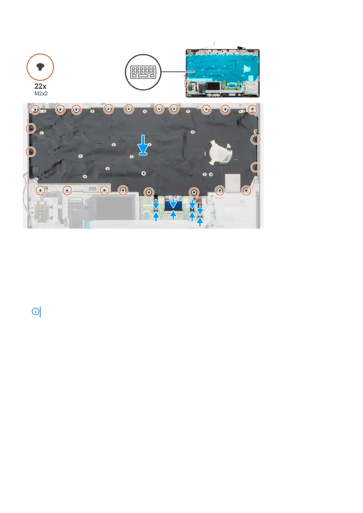 3. Install the 22 (M2x2) screws that secure the keyboard to the chassis of the computer.