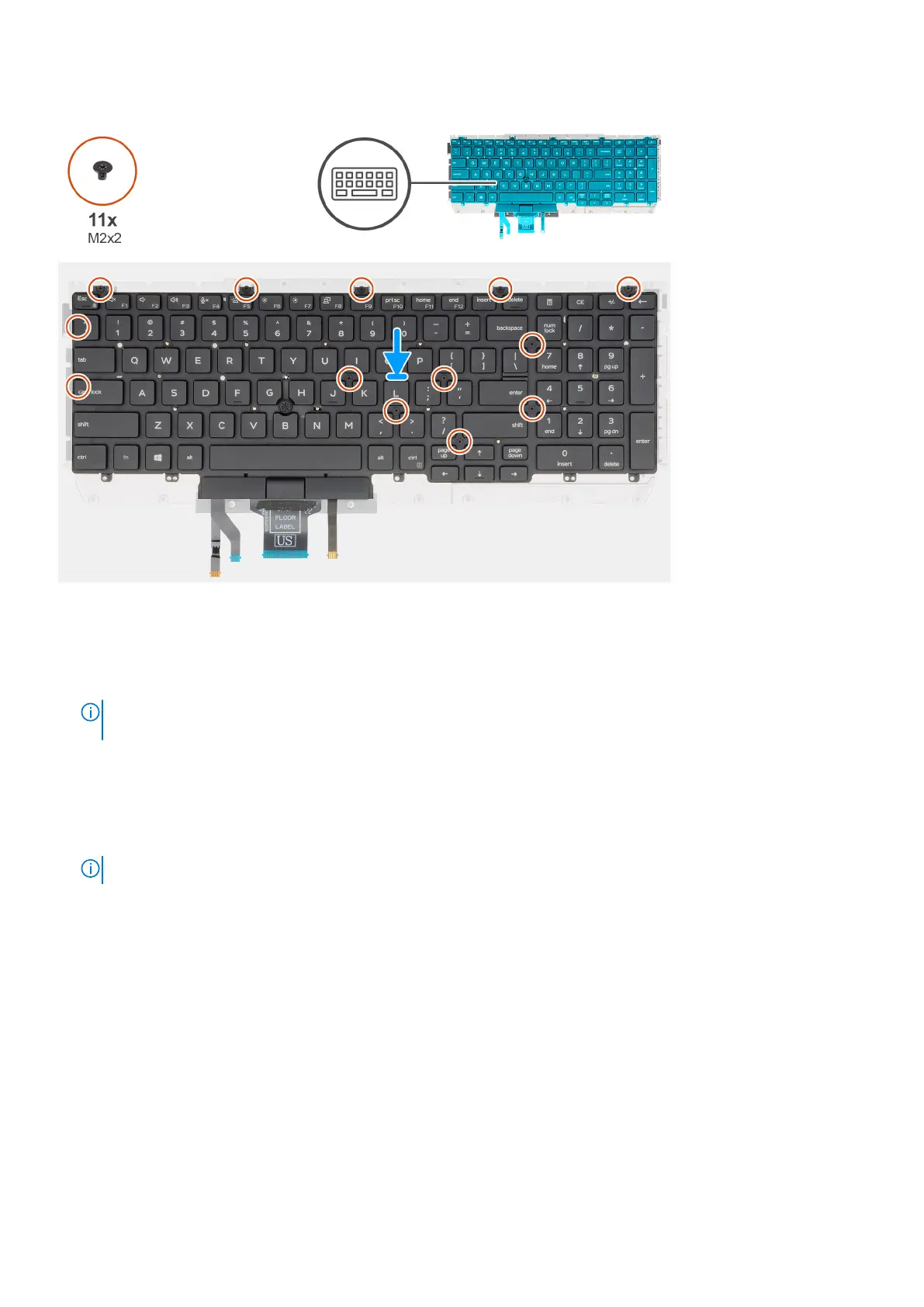 4. Install the eleven (M2x2) screws to secure the keyboard to the keyboard bracket.