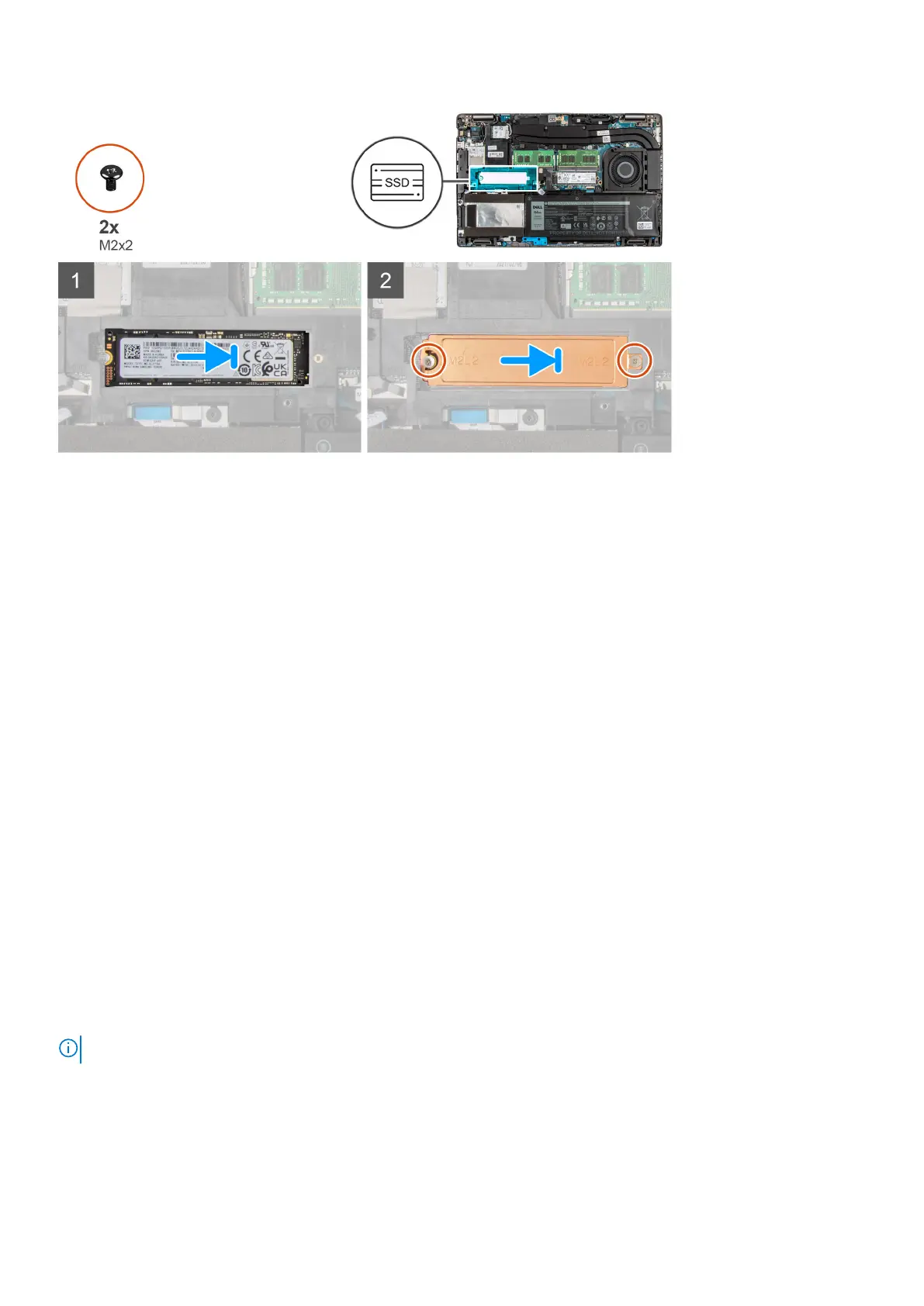 5. Replace the two (M2x2) screws that secure the 2280 solid-state drive to the palm-rest and keyboard assembly.
