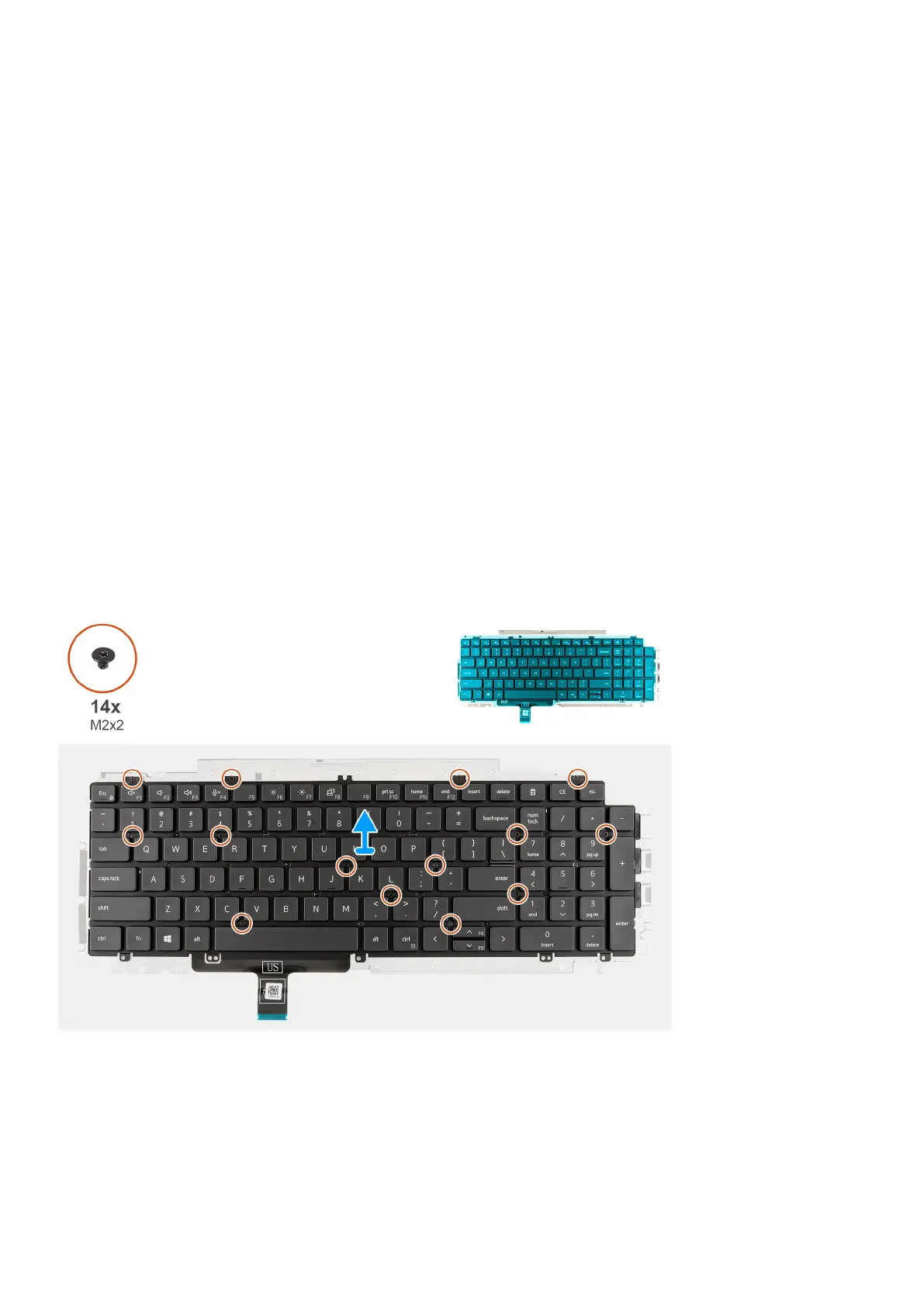 1. Remove the fourteen (M2x2) screws that secure the keyboard to the keyboard bracket.