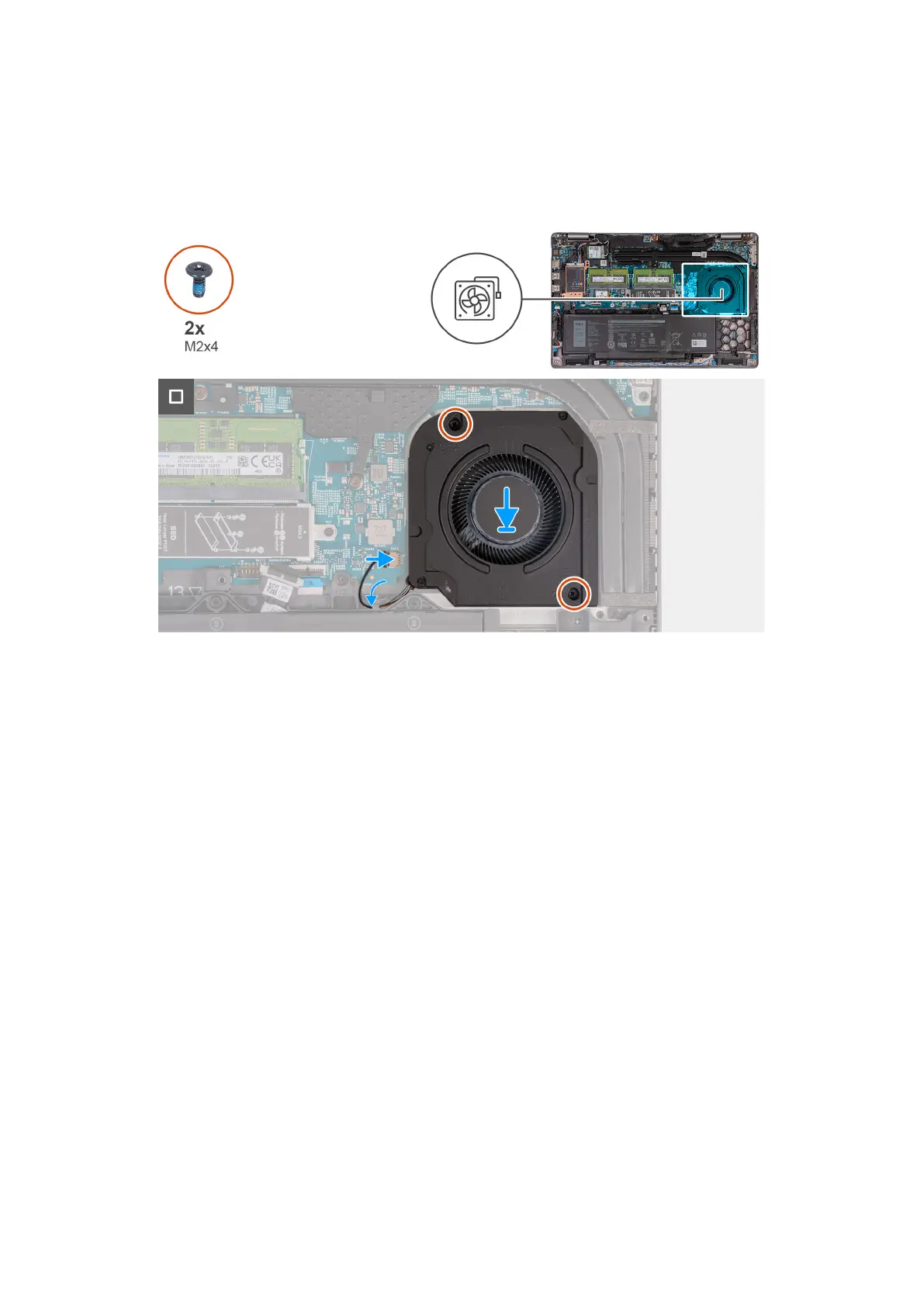 2. Replace the two screws (M2x4) that secure the fan to the palm-rest assembly.