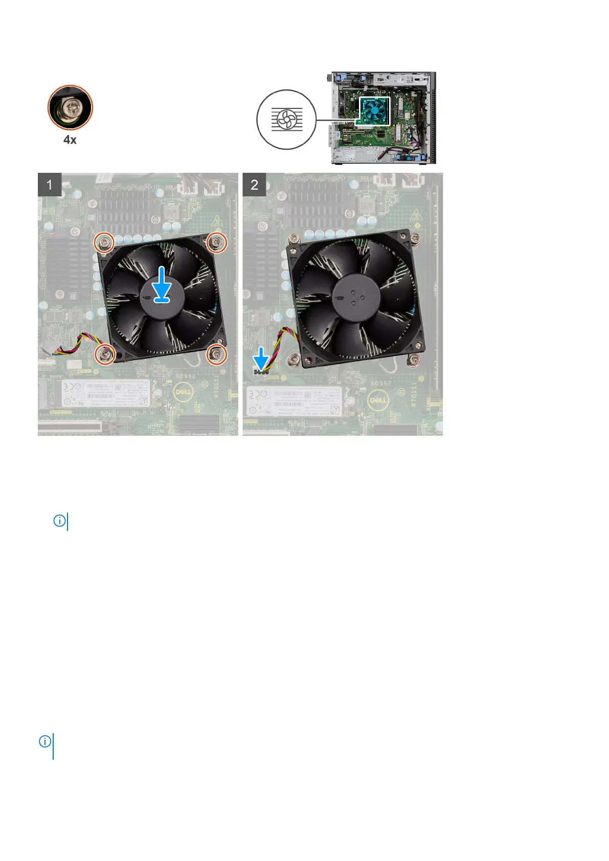 2. Tighten the four captive screws that secure the processor fan and heat-sink assembly to the system board.