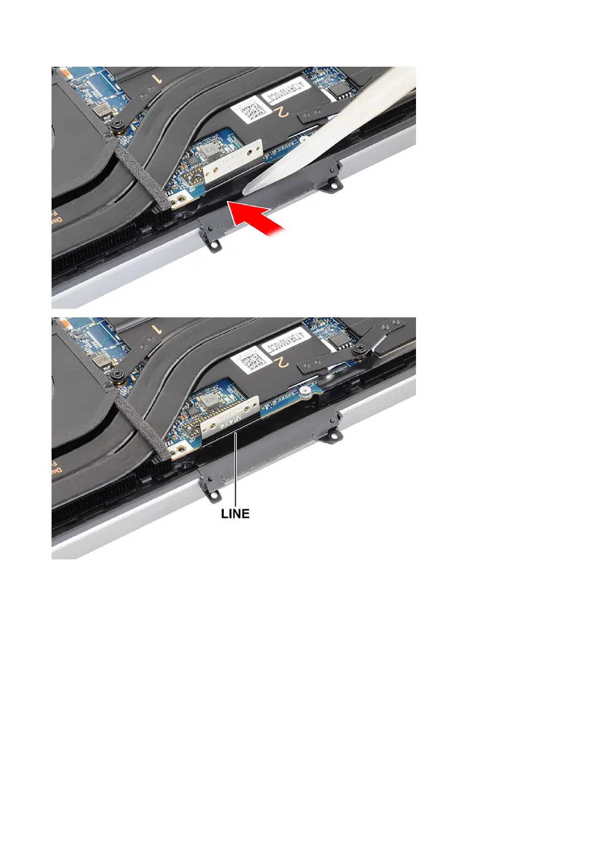 5. Replace the two (T5, M1.4x4) Torx screws that secure the display FPC to the system board.