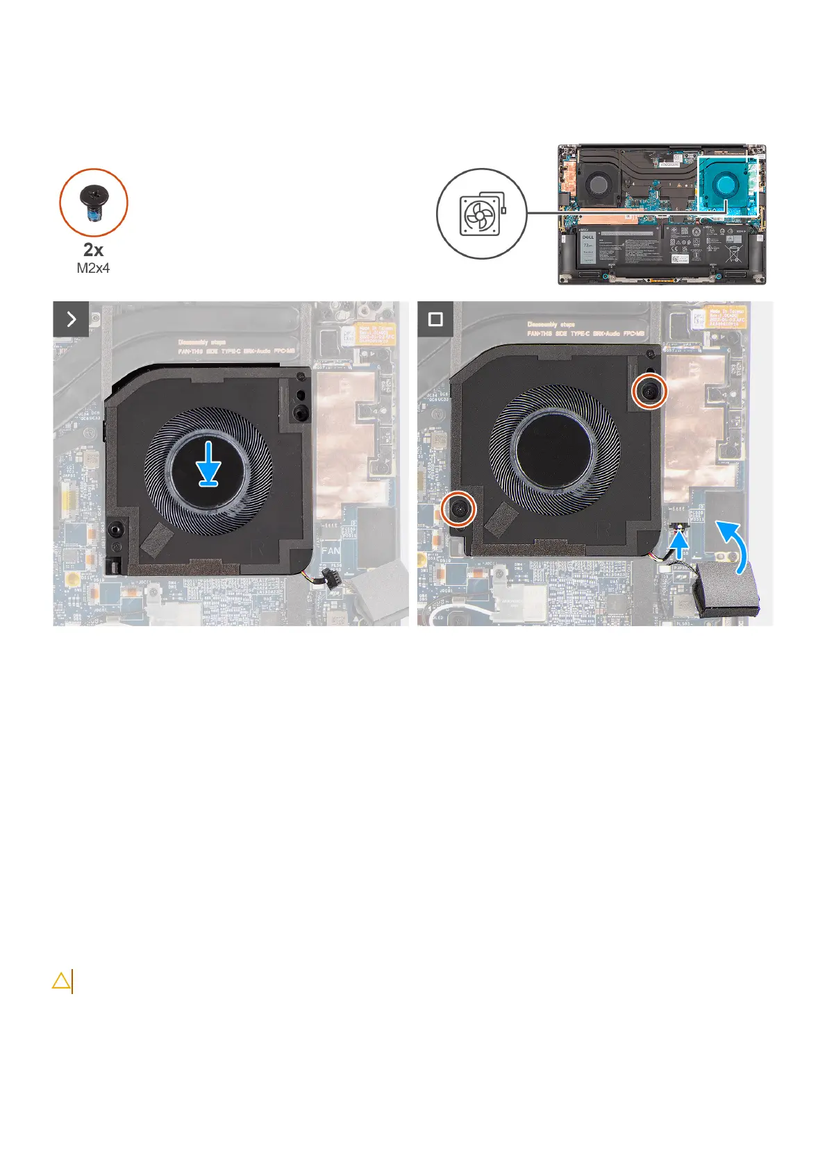 2. Replace the two screws (M2x4) to secure the processor fan to the palm-rest and keyboard assembly.