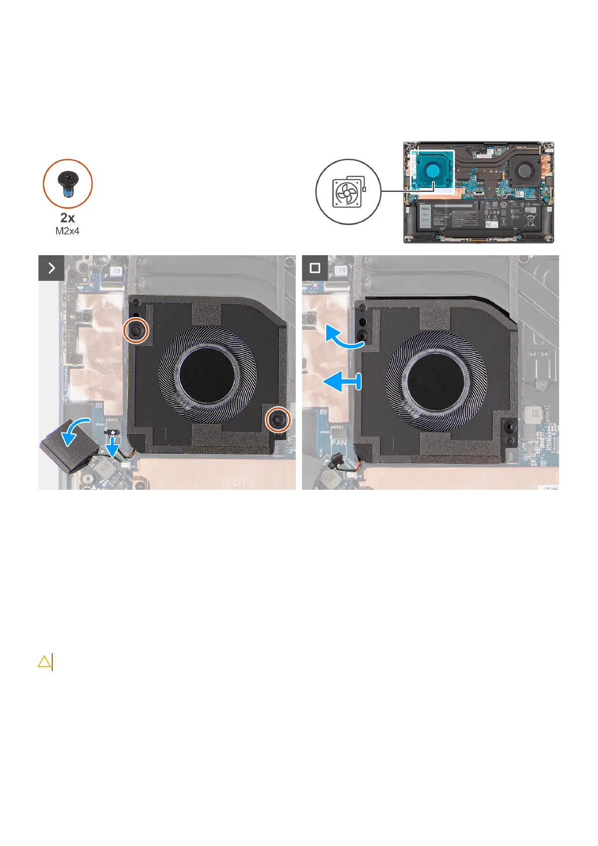 3. Remove the two screws (M2x4) that secure the graphics-card fan to the palm-rest and keyboard assembly.