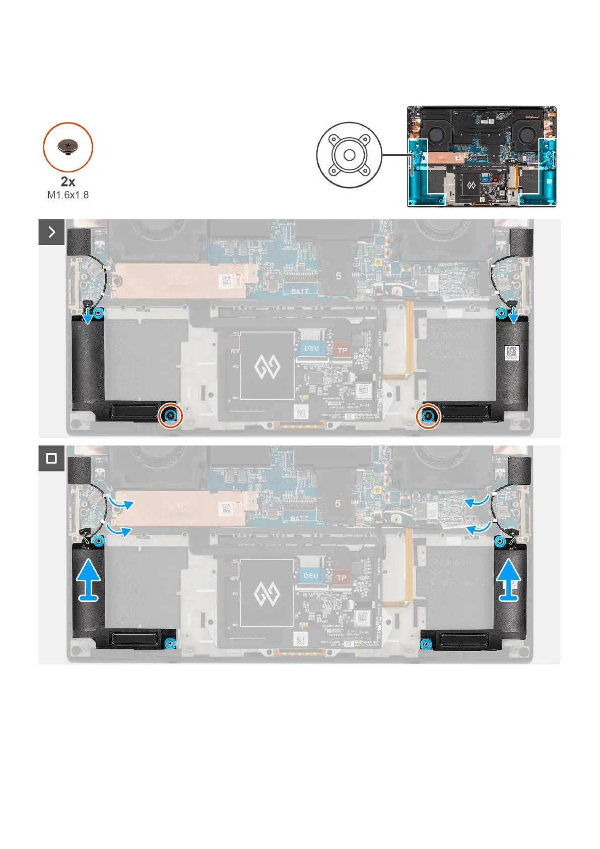 3. Remove the two screws (M1.6x1.8) that secure the left and right speakers to the palm-rest and keyboard assembly.