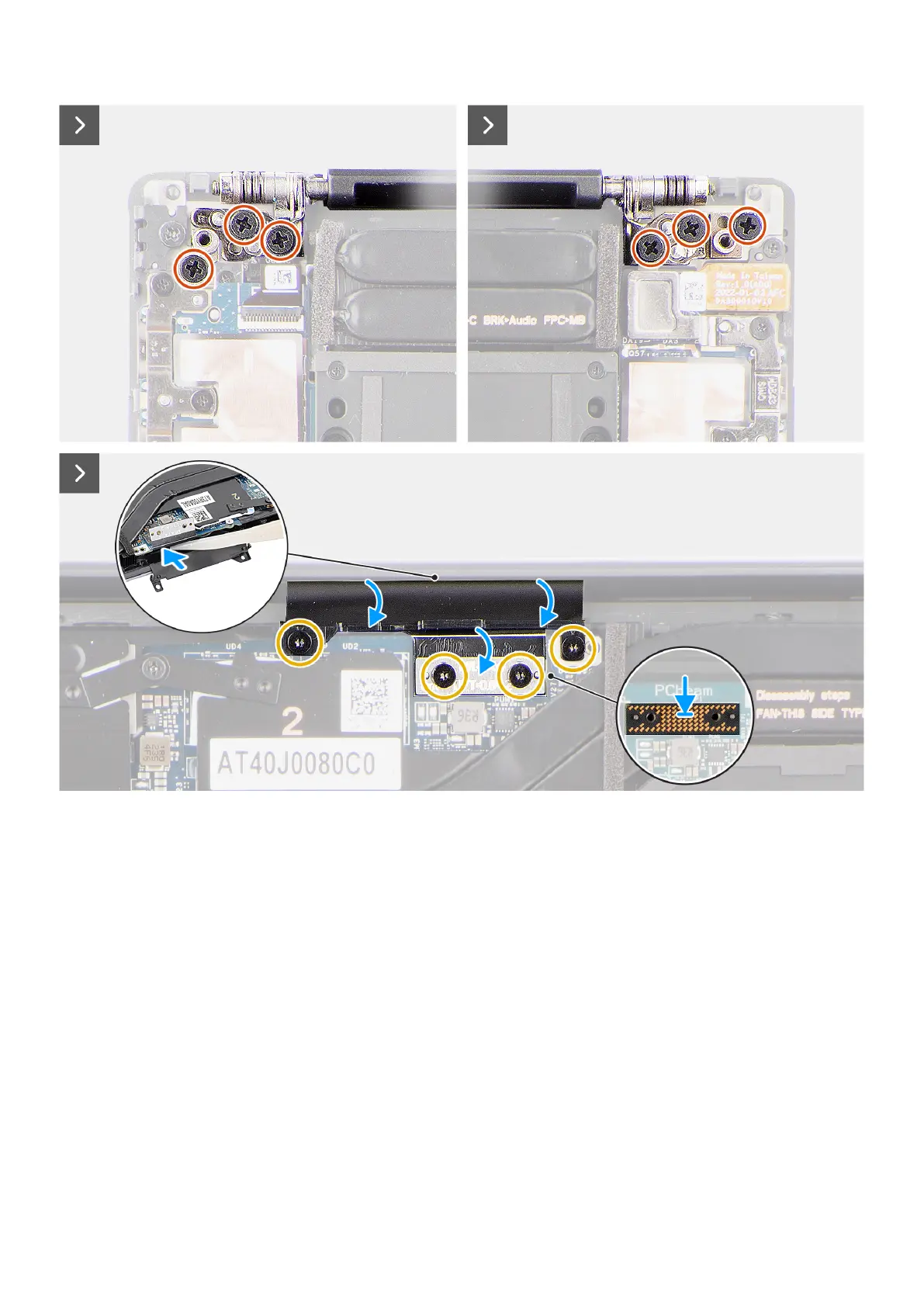 2. Replace the six screws (M2.5x5) to secure the display assembly to the palm-rest and keyboard assembly.