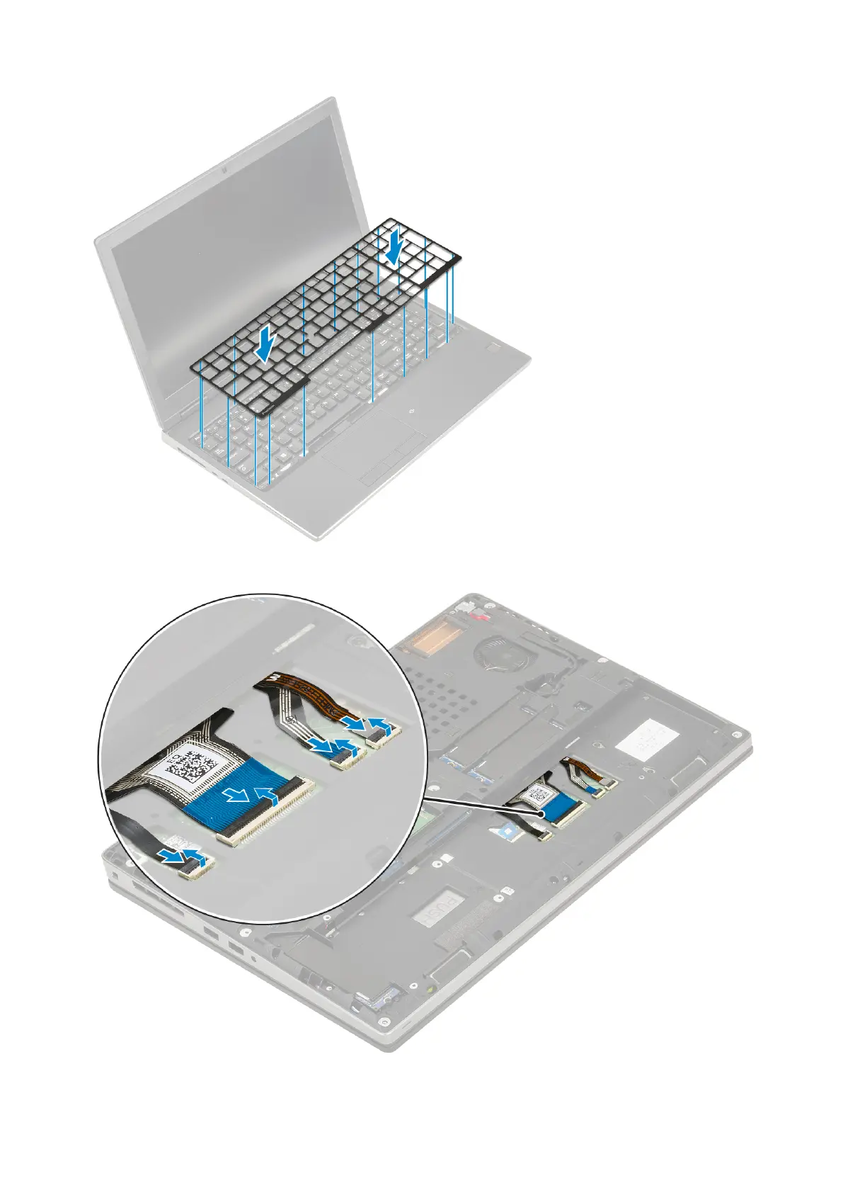 f. Connect the keyboard cable, fingerprint cable and fingerprint button cable to the connectors on the system board.