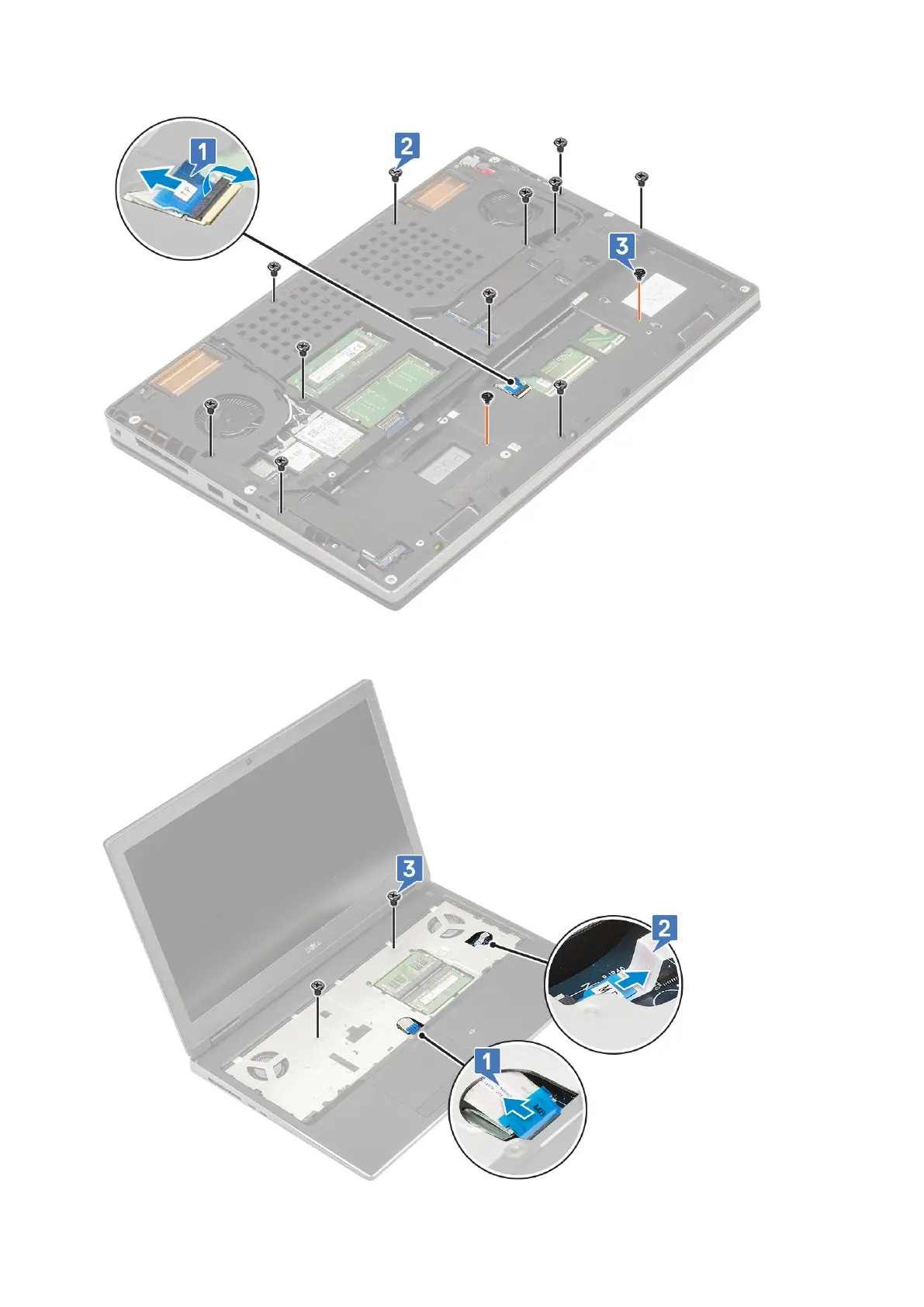 d. Remove the 2 (M2.0x3.0) screws that secure the palmrest to the system [3].
