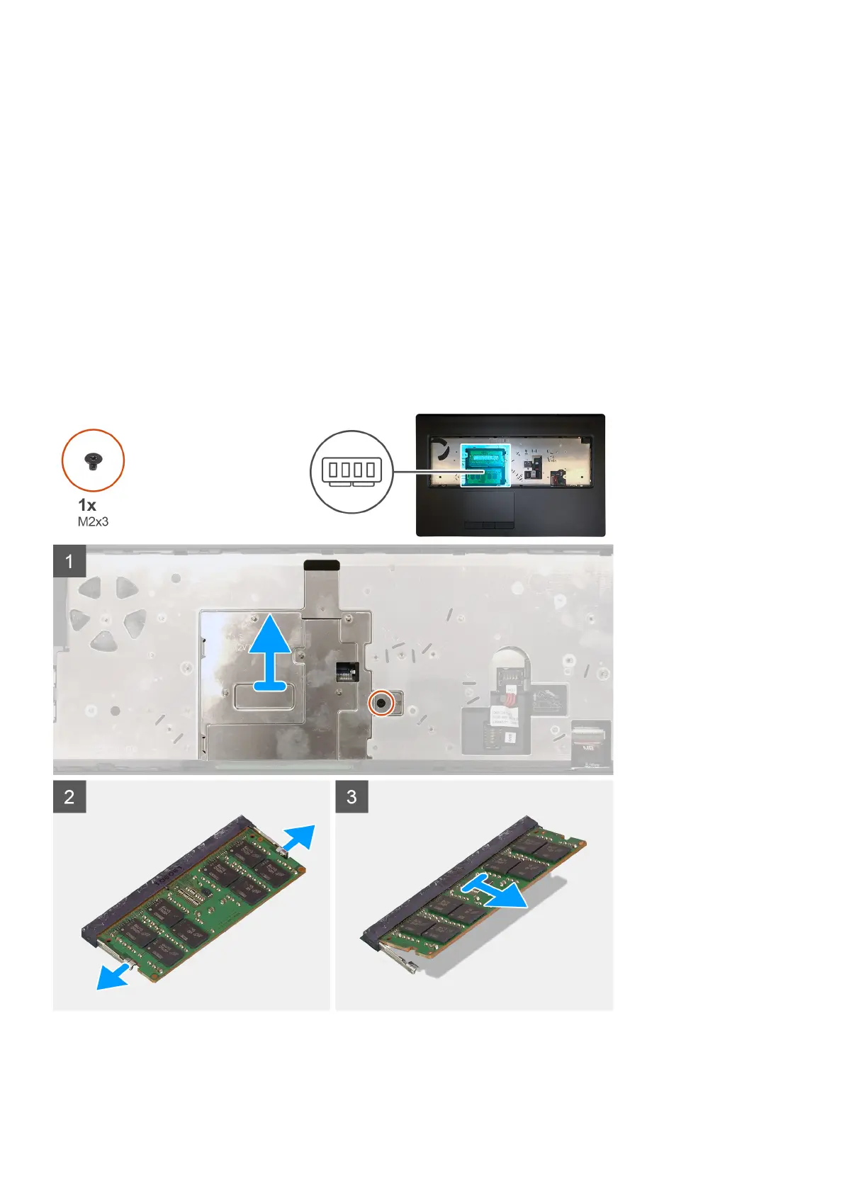 1. Remove the (M2x3) screw that secures the memory shield in place.