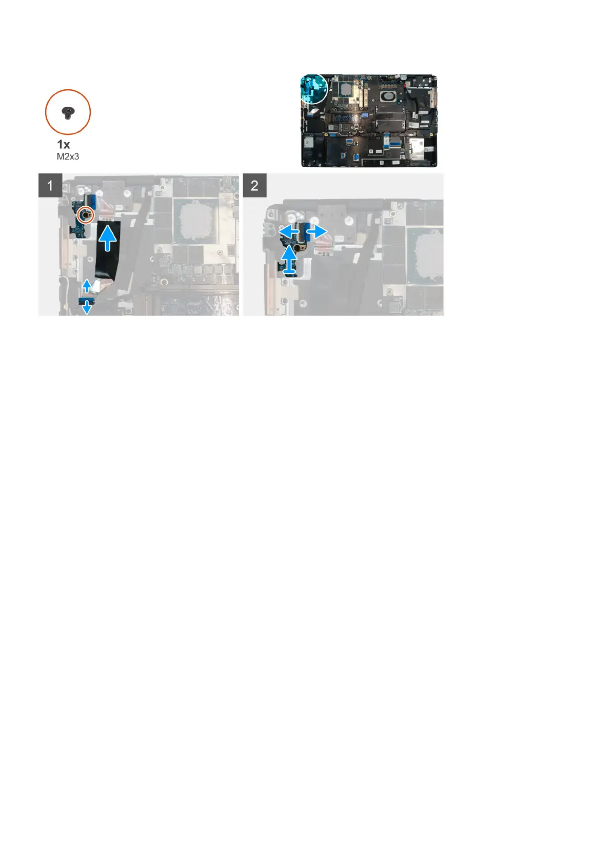 3. Remove the (M2x3) screw that secures the power button board to the computer.