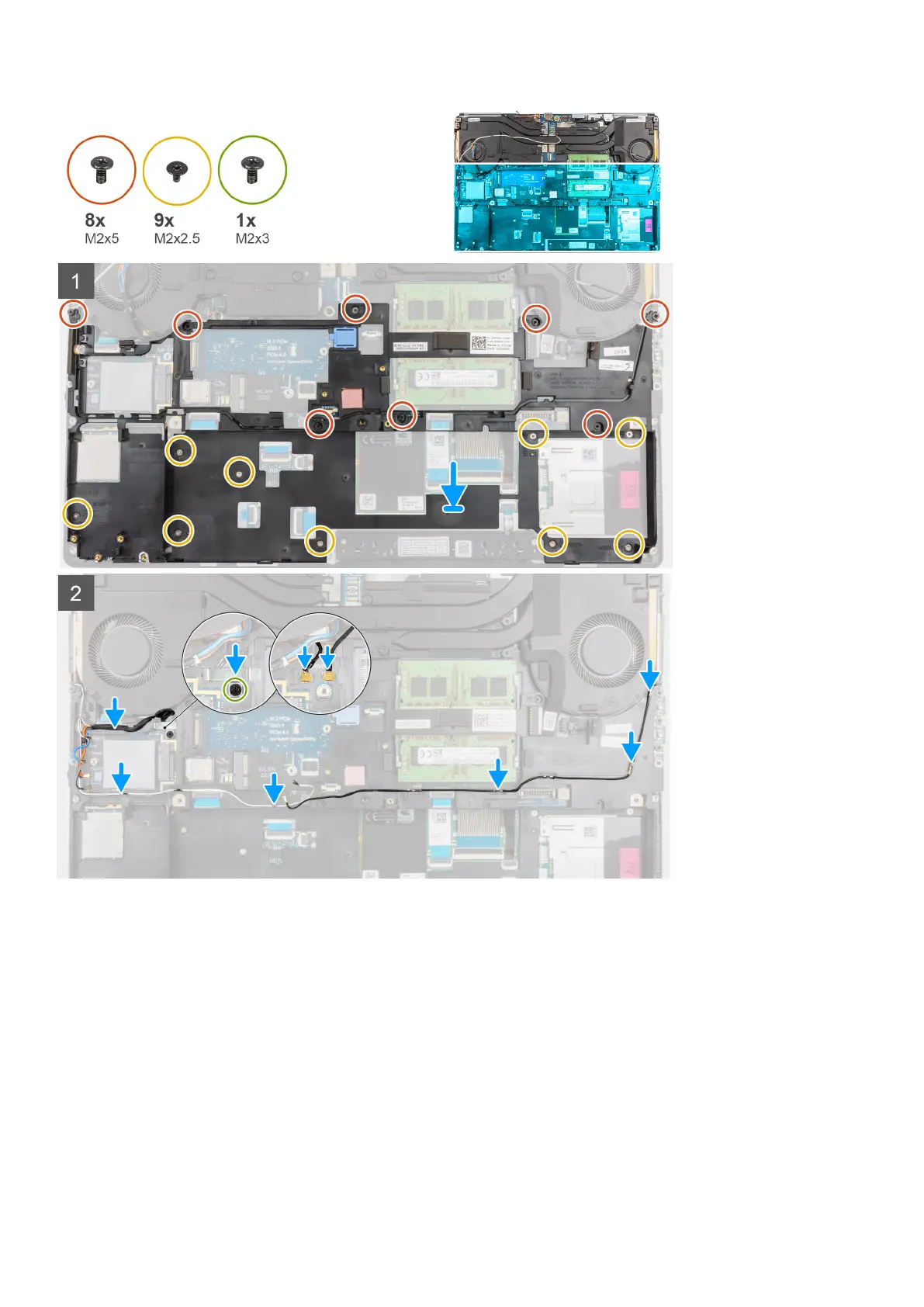 2. Replace the eight (M2x5) and the nine (M2x2.5) screws to secure the inner frame in place.