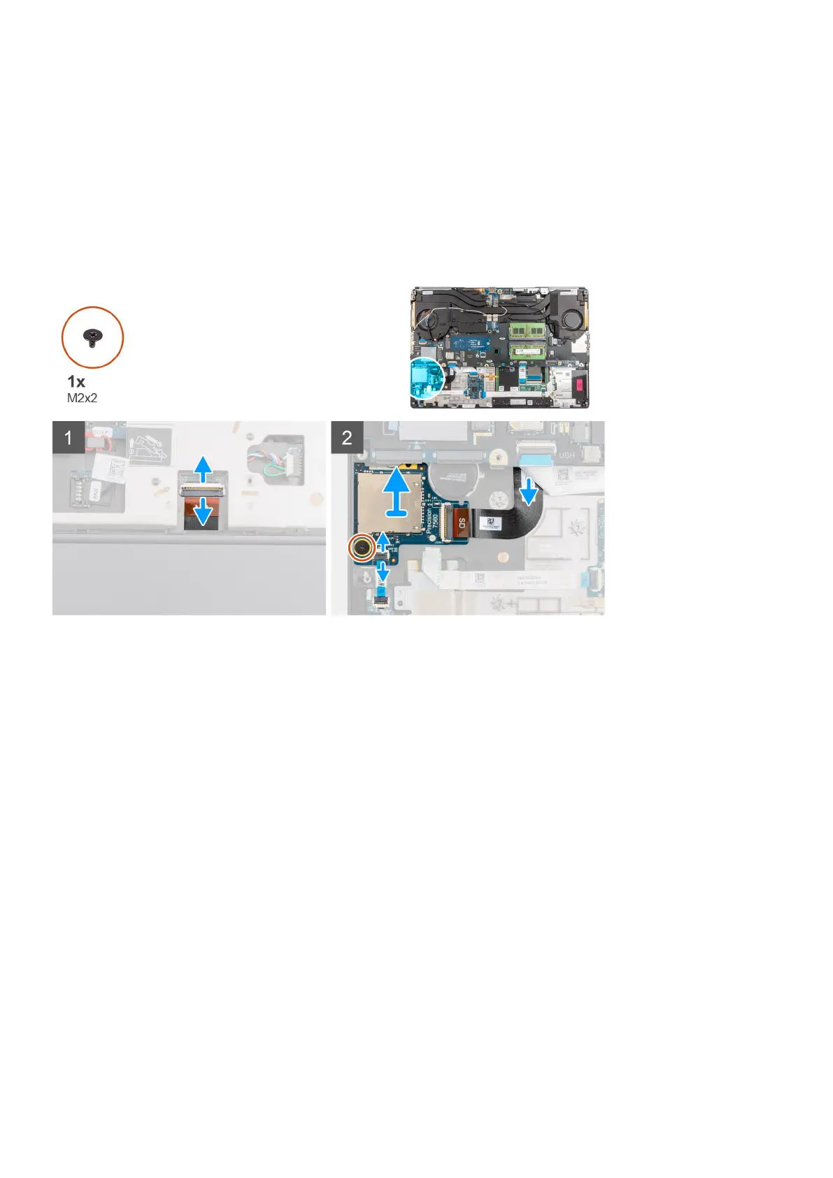 3. Remove the (M2x2) screw that secures the SD card reader in place.