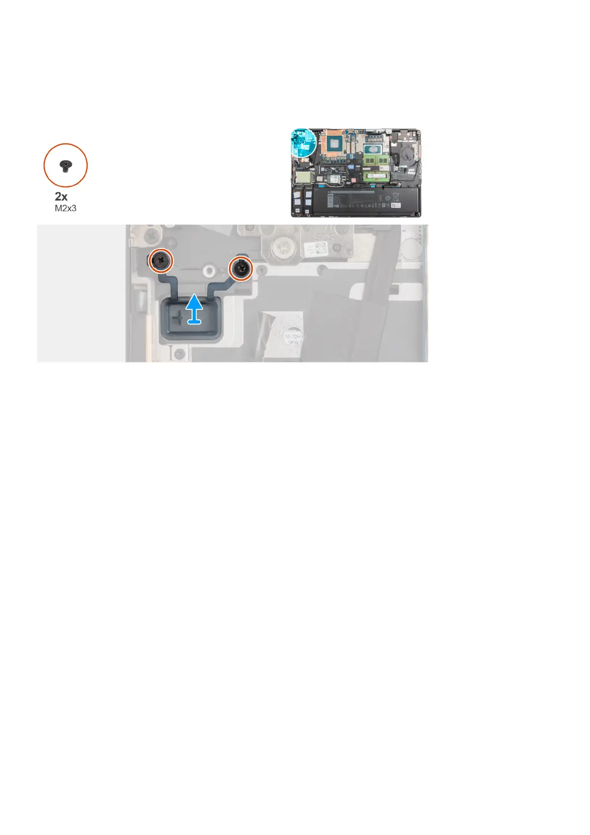 1. Remove the two (M2x3) screws that secure the power button in its slot on the computer.